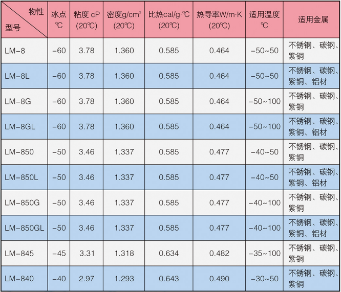 LM-8系列冰河冷媒由改性有機酸鹽構成,主要添加劑包括防腐蝕劑,防霉劑,增溶劑,穩(wěn)定劑等。外觀為淺色液體,沸點高于105℃,不易揮發(fā),無閃點,不可燃,低毒。
