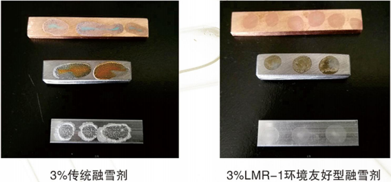3、防腐性能好,采用M3超膜防銹技術(shù),對碳鋼、銅、鋁合金等金屬幾乎不腐蝕;對瀝青、混凝土路面腐蝕小。LMR-1融雪劑防銹性能見下圖。