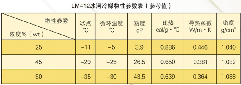 本品適用于保鮮庫、冷藏庫、低溫庫做間接制冷載冷劑使用。使用時先將系統(tǒng)清洗干凈,然后根據(jù)庫溫將本品加水稀釋到指定濃度使用,具體使用濃度,及物性參數(shù)參考下表。