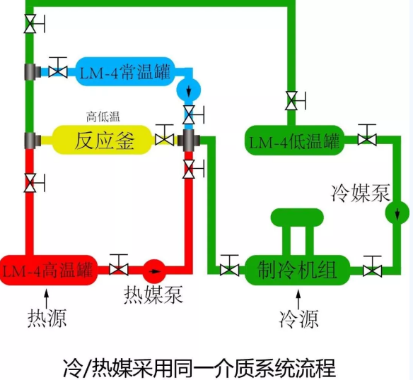 冰河冷媒科技有限公司與醫(yī)藥、化工、制冷等行業(yè)皆有深入合作,針對常規(guī)冷熱切換工藝存在的缺陷,將工藝優(yōu)化為如圖所示的LM-4冰河冷媒換熱控制系統(tǒng)。