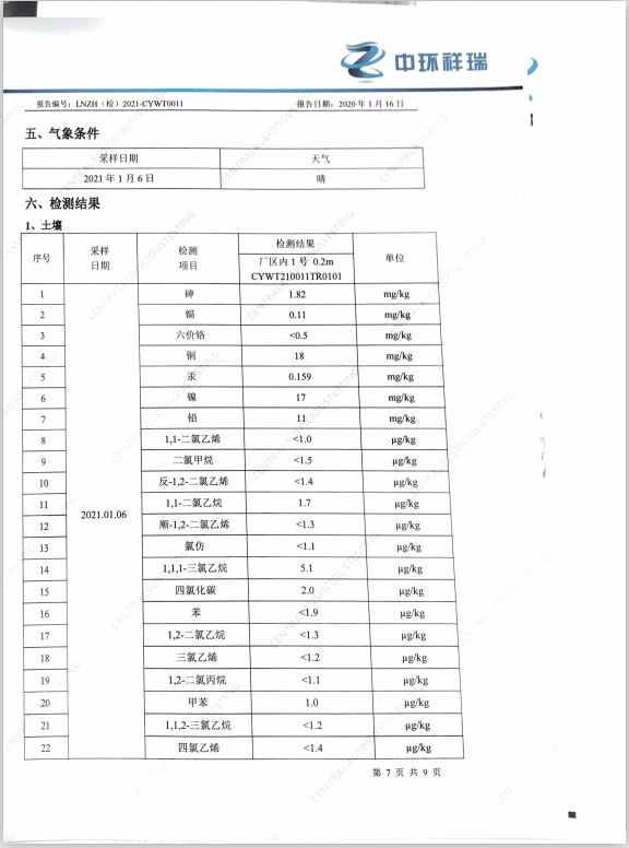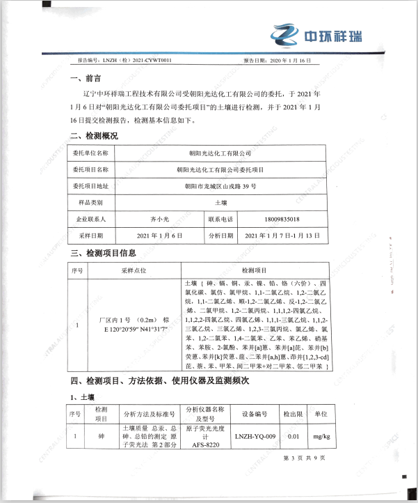朝陽光達(dá)化工有限公司西廠區(qū)土壤檢測報(bào)告公示